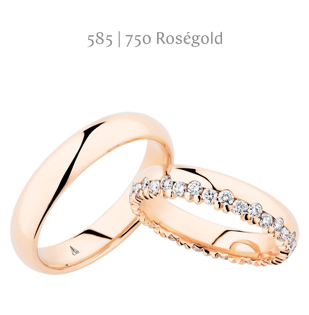 Die abgebildeten Trauringe sind in 585erer Roségold (18 ct.) verarbeitet. Diese fertigen wir für Sie gerne auf Wunsch auch in 585er bzw. 750er Gelbgold, Weißgold, Rotgold oder 950er Platin an.
